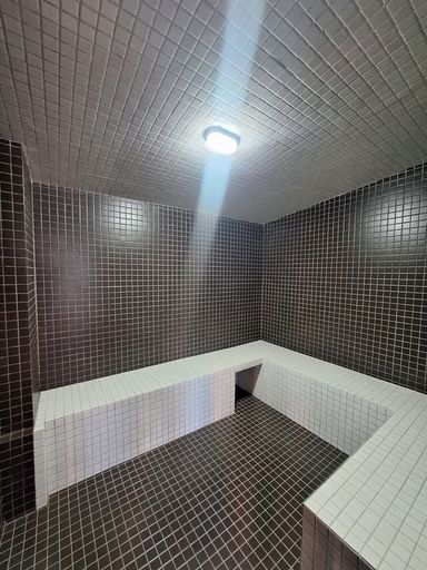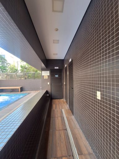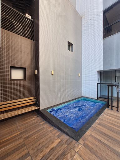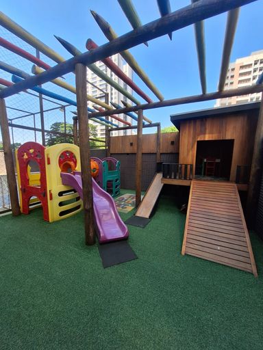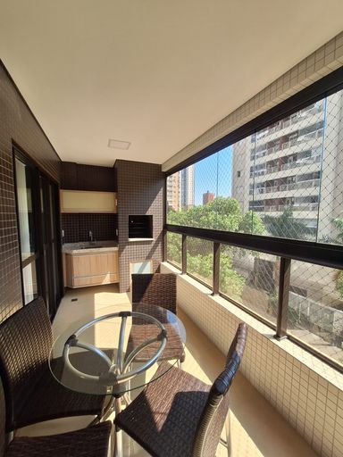 Sacada fechada em blindex e equipada com churrasqueira a carvão.